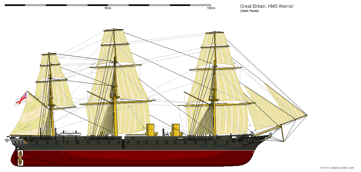 | ウォーリア | Warrior | Thames Ironworks and Shipbuilding Company, Blackwall, London | 1861/10/24 | 1883/5/31 | ◎1859/5/25 起工 ◎1860/12/29 進水(テームズ河の冬は寒さが厳しく進水するのに手こずる) ◎1861/9/20 ドックにて船底の掃除と防虫塗装を施す ◎1862年3月から6月にかけて、試験中に発見された欠陥が修正され、損傷は修復された。変更点には、より軽量なバウスプリットと短いジブ・ブームの装備、そして船体中央部への追加ヘッドの設置が含まれていた ◎海峡戦隊 Channel Squadronに編入 ◎1864年11月に退役、改修を始め、その間に実用上効果が実証されていなかったアームストロング砲が撤去され、武装が最新の施条付き前装砲に更新された ◎1867 再役 ◎1869年8月下旬にイギリスに帰還。船体を清掃し、衝突で失われた船首像を交換する改修後、ウォリアーは海峡艦隊に復帰した ◎1871 退役、改装 ◎1875 再役、ポートランド沿岸警備区に編入 ◎1878 支援艦隊に編入 ◎ウォリアーは1887年に「スクリュー戦艦、三等、装甲 screw battle ship, third class, armouredに再分類され、1892年5月にはふたたび一等装甲巡洋艦に再分類されたが、変更は行われなかった。1894年になっても近代化改修が検討されたが、少なくとも1基の新しいボイラーを設置したのち、不経済であるとして却下された。1900年3月、ポーツマスで有効リストから外され、ハルクに分類された ◎1881 クライド沿岸警備区に編入、予備役軍人の訓練艦となる ◎1883年から18年間をポーツマスにて予備艦として過ごす ◎1902 ポーツマスにて水雷駆逐艦母艦任務につく ◎1904 ポーツマスにてヴァーノン水雷学校の訓練施設となる、ヴァーノンIII Vernon IIIと改名 ◎1929 廃艦としてミルフォード・ヘイヴン湾に送られ、給油用の浮き桟橋の燃料油ハルクC77 Oil Fuel Hulk C77に使われることになった(~1978) ◎1979 ミルフォード・ヘイヴン湾からイングランド北部東岸のハートルプール港に回航、復元工事(回復作業はまず、燃料突堤への転換の際に上甲板に流し込まれた分厚いコンクリートを含む80tものゴミを除去することから始められた。そののち、8年の歳月と£8,000,000の資金をかけて、甲板、内部区画、主機や木工品、什器類が復元され、または再作成された。またマストや索具、煙突なども再現され、1960年代に破壊された船首像もオリジナルの写真を手本に新たに制作された) ◎1987年6月16日、ウォーリアはほぼ完全に復元された状態で、現在の場所であるポーツマスに到着した ◎復元された装甲艦はウォーリアと改名されたが、イギリス海軍の作戦司令部HMSウォーリア(現在のノースウッド司令部 Northwood Headquartersと同立地)との混同を避けるため、正式名称はウォーリア(1860) Warrior (1860)として区別される ◎博物館船となる |