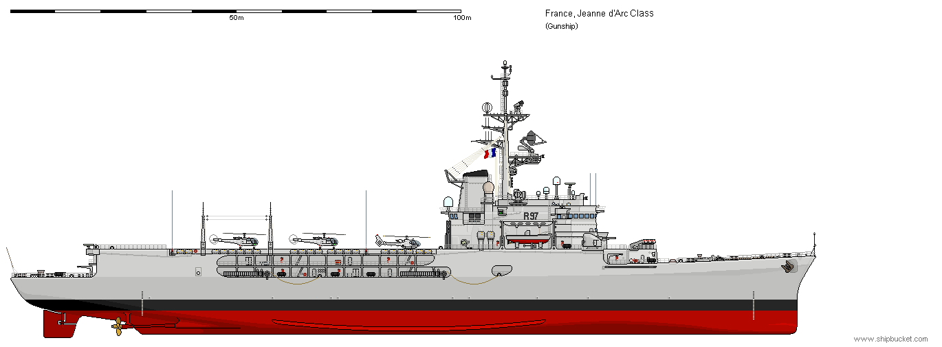| ジャンヌ・ダルク | Jeanne d'Arc | R 97 | Brest DCNS | 1964/7/16 | 2010/5/27 | 2010/9/1 | ◎1960/8/7 ラ・レゾリュー La Résolueとして起工 ◎1961/9/30 進水 ◎1964 ジャンヌ・ダルクと改名 ◎2002/3初 “アナコンダ作戦 Operation Anaconda”に参加 ◎2008 ジャンヌ・ダルクはアデン湾で海賊対策任務に就いた。同艦は、2008年4月の人質事件において、高級商業ヨットLe Ponantの救出活動に投入された。ジャンヌ・ダルクから出撃したガゼル・ヘリコプターは、狙撃兵を乗せ、人質解放後に四輪駆動車で逃走した海賊を追跡し、捕らえた ◎2009/3 “アタランタ作戦 Operation Atalanta”参加するためソマリア沖・アデン湾に展開している ◎2009/12 最後の航海を開始(~2010/5) ◎2010/9/9 艦首記号をQ 860に改める、Piriouasへ移送され、船体の固定と残りの回収可能なハードウェアの取り出し作業が行われた ◎2016 解体のためVeolia Groupの子会社Bartin Recycling Group and Pétroferに売却(売却額€約11,500,000) ◎2016 Bordeauxにて解体終了 |