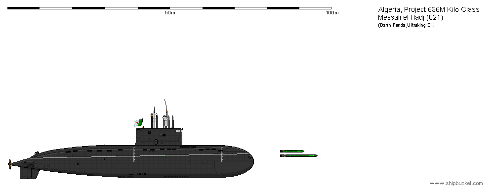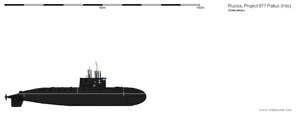 水上排水量:2,300t~2,350t 水中排水量:3,000t~3,950t(満載時) 全長:70.0m~74.0m 最大幅:8.30m 吃水:6.5m 主機/軸数:ディーゼル発電機2基+航行用電動機1基/1軸 出力:ディーゼル発電機(1,000kW)、電動機(5,500~6,800kW) 速力:水上10kt~12kt/水中17kt~25kt 航続力:シュノーケル使用時7ktで6,000浬~7,500浬、全速時21ktで12.7浬/水中3.0ktで400浬 兵装:533mm魚雷発射管6門、魚雷、巡航ミサイル計18本、機雷24発、SA-N-8グレムリン8発、またはSA-N-10ギムレット地対空ミサイル8発(輸出用には対空兵器は装備されていない可能性がある) 潜行深度:240m(運用時)、300m(最深) 乗員:52名
